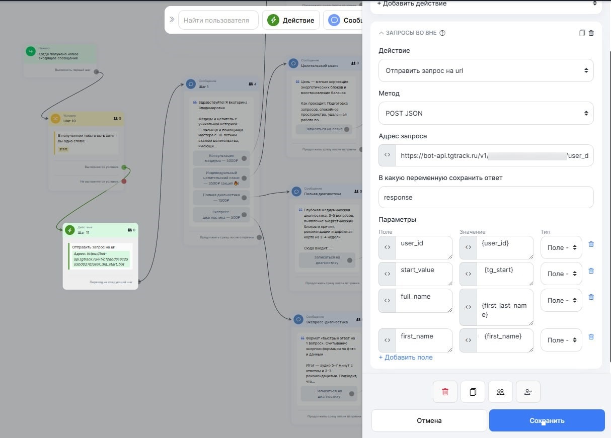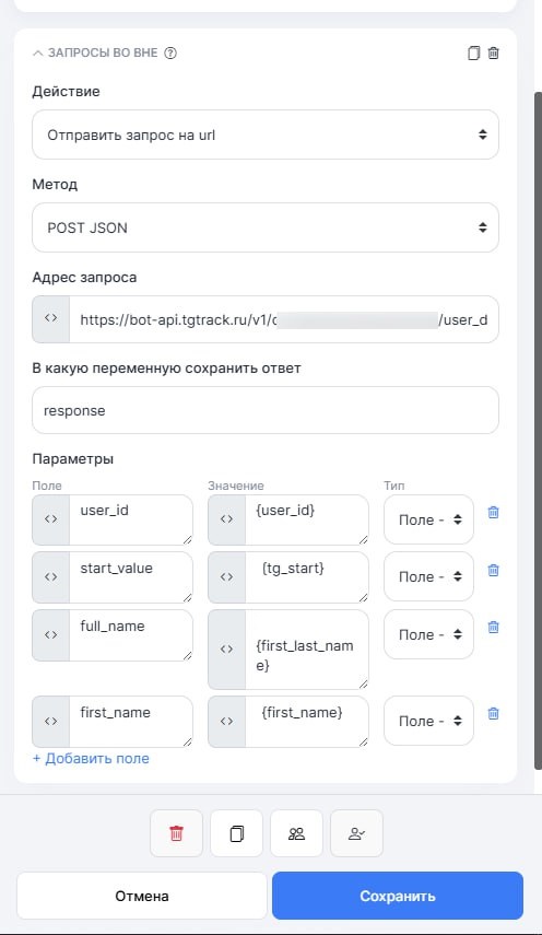 - В самом боте перед началом воронки создайте блок внешнего запроса