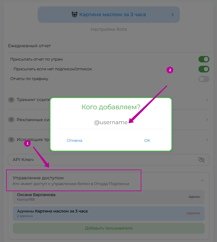 - Подключить своего бота, в который ведёте трафик к Откуда Подписки и получить API ключ